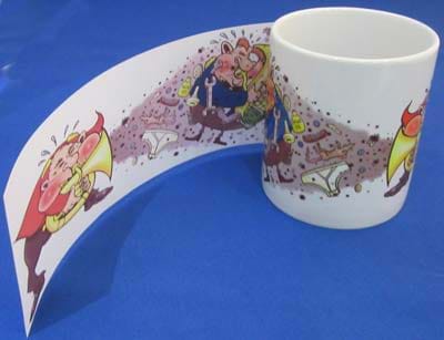 הכוס,הצבע השחור הולך ונעלם ובמקומו מתגלה הגרפיקה שהודפסה על הכוס בשיטת הסובלימציה.