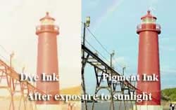 עמידות של אותה תמונה שהודפסה עם דיו פיגמנט מימין PIGMENT