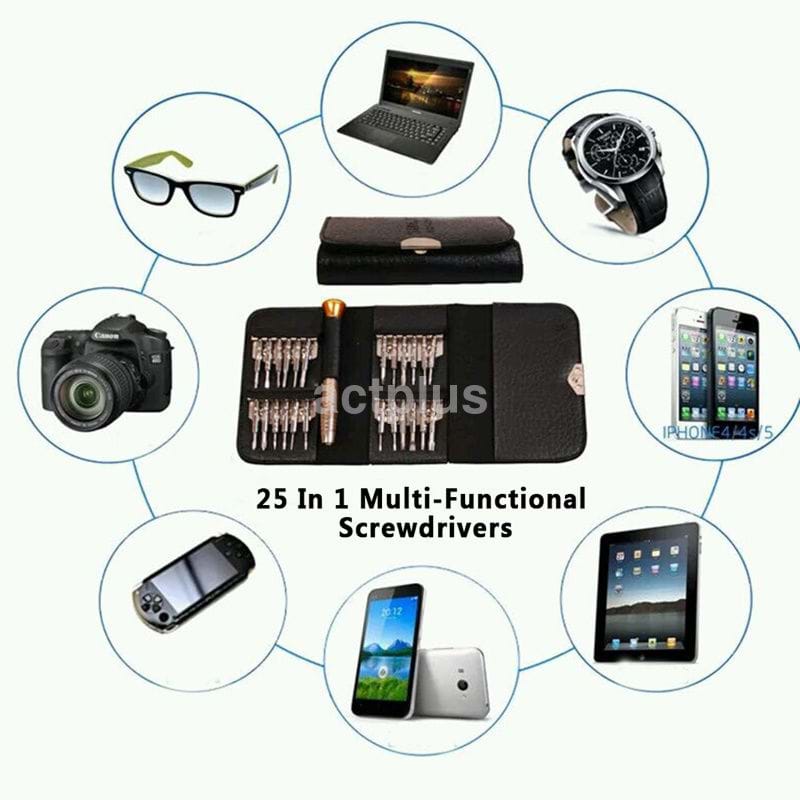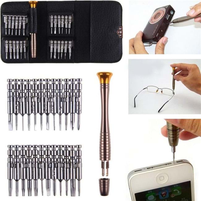 סט 25 ביטים לברגים קטנים ולתיקונים של מכשירים עדינים -ראשי הברגה באיכות גבוהה עשויים כרום ואנדיום. -ידית מברג איכותית,נוחה וארגונומית עם נעילה של כל ביט. -ביטים עם ראש פיליפס,ראש שטוח וטורקס. סט 24 יחידות מותאם לטיפול ב-רב המככשירים הדיגיטלים,סוגים רבים של מחשבים,מכשירי סלולר וטאבלט,משקפיים,מצלמות,שעונים ועוד. -כמות:סה"כ 25 יחידות. -קל להתקנה ופירוק. -אינו מחליד,נגד החלקה. -הביטים מגיעים במארז דמוי עור עם תפסים לאחסנה נוחה ומסודרת שלהן.