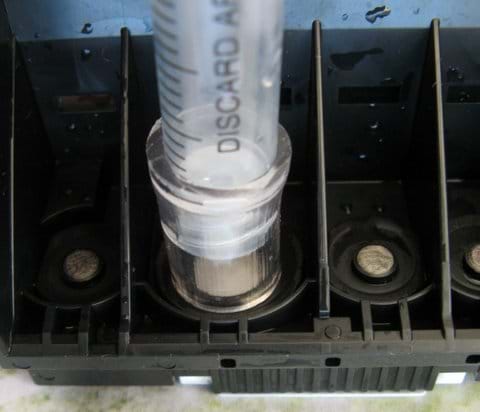לוחצים את המזרק סביב הפילטר בראש פירוק ראש ההדפסה,מרימים את המנוף משמאלההדפסה ומזריקים חומר ניקוי4.לבצע הדפסות ניסיון הדפסה על נייר רגיל עד שהדיו האכיל ייכנס אל ראש ההדפסה במקום חומר הניקוי.