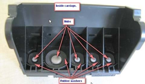 אופן ביצוע ניקוי ראש הדפסה במדפסת דיו אכיל:1.יש לשטוף במים מזוקקים או מסוננים(תמי 4 או מערכת דומה) מסביב לעיגולים האפורים(פילטרים) הנראים בתמונת ראש ההדפסה למעלה ומסומנים בחיצים אדומים.
