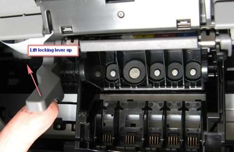 ניתן לפרק את ראש ההדפסה ע"י הרמת המנוף משמאל-מסומן בחץ אדום בתמונה השמאלית למטה.